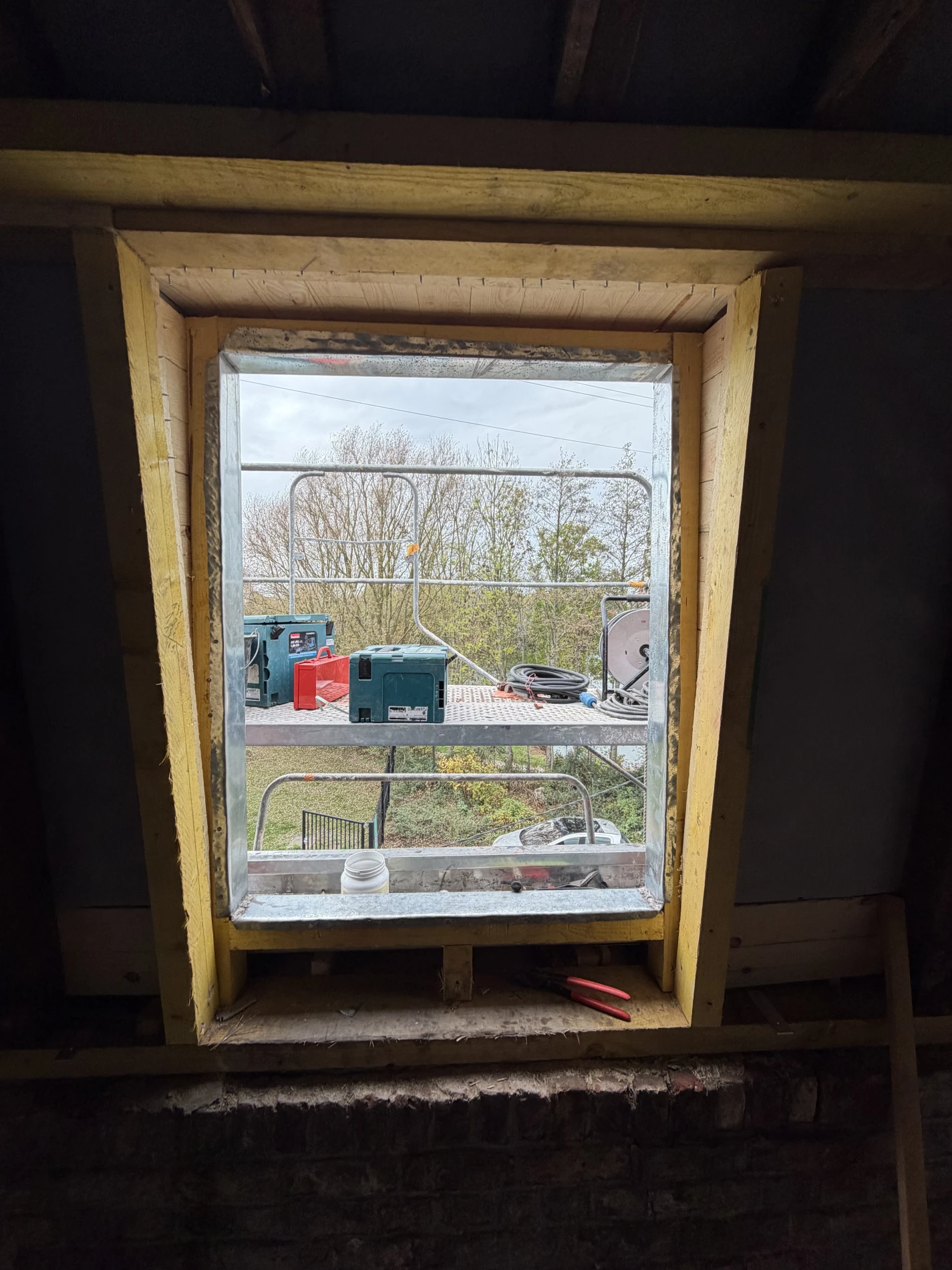 Nous procédons à la création d’une trémie dans la charpente, adaptée aux dimensions du Velux 134x140 cm, modèle Confort WhiteFinish.